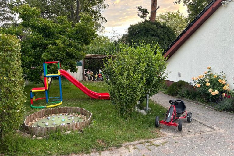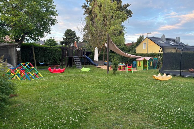 Unser wunderschöner Außenbereich erstreckt sich über 500 m² und bietet somit viel Platz für unsere 10 Kinder. Besonders im Sommer wird der Garten zu einem echten Erlebnis: Ein Wasserlauf, der über eine Handpumpe betrieben wird und in der Buddelkiste endet, sorgt für große Begeisterung. Auch Wasserspielzeuge, die über den Gartenschlauch genutzt werden, sowie hin und wieder ein kleiner Swimmingpool finden großen Anklang. Eine weitere schöne Abwechslung bietet der neu gebaute Spielplatz, der fußläufig in etwa sechs Minuten erreichbar ist und von unseren kleinen Zwergen sehr gerne besucht wird.