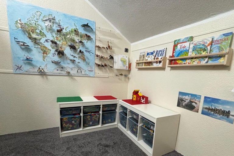 Gleichzeitig gehört dieser Raum zu unserem Bildungsbereich „Tiere und ihre Lebensräume“. Eine große Weltkarte mit verschiedenen Tieren lädt die Kinder dazu ein, spielerisch zu entdecken, auf welchem Kontinent welche Tiere zu Hause sind. So können sie erfahren, wo Elefanten leben, wo Pinguine zu finden sind oder in welchen Regionen der Welt Giraffen zu Hause sind.