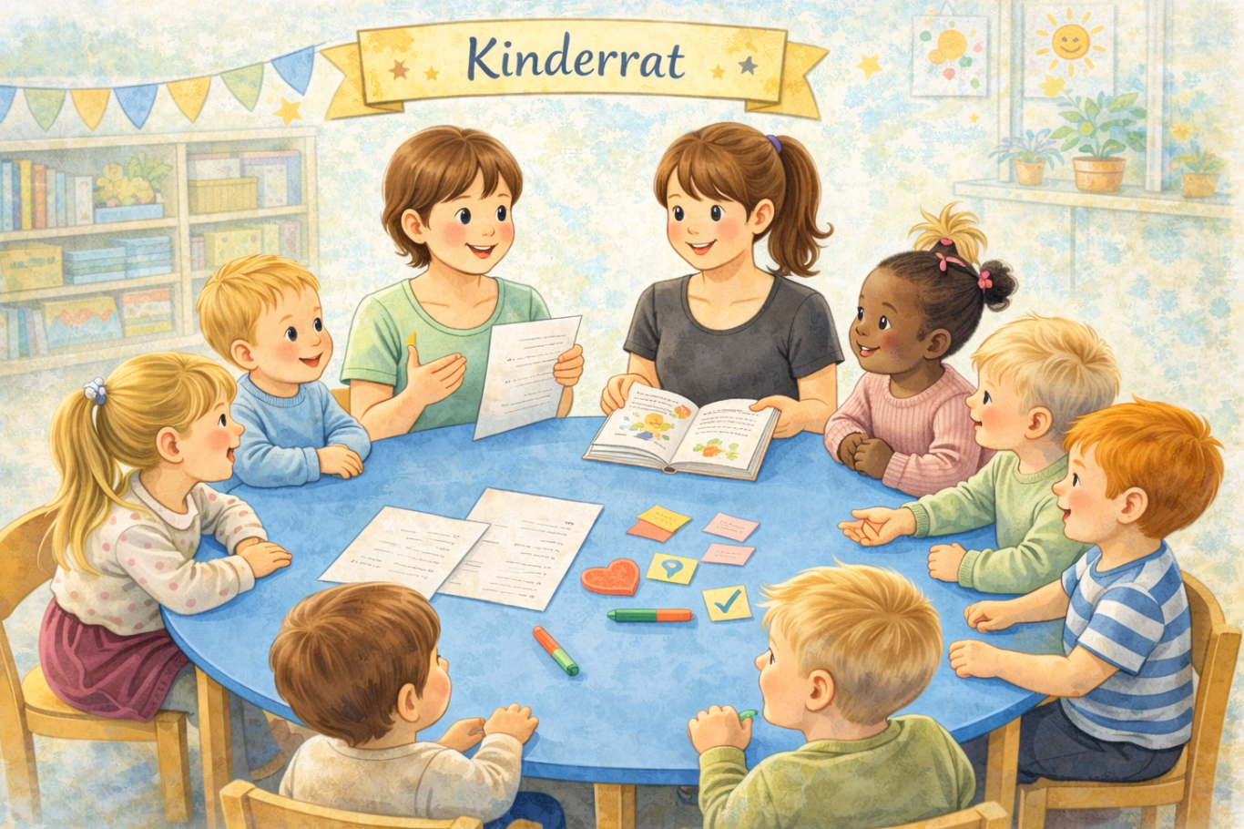 In unserem Kinderrat bekommen alle Kinder die Möglichkeit, ihre Gedanken, Wünsche und Ideen einzubringen und jedes Kind kommt zu Wort. Gemeinsam sprechen wir über Erlebnisse, planen Ausflüge oder Projekte und sammeln Wünsche für den Speiseplan. Auch aktuelle Themen aus dem Alltag oder kleine Konflikte können hier besprochen werden, sodass wir gemeinsam nach Lösungen suchen.