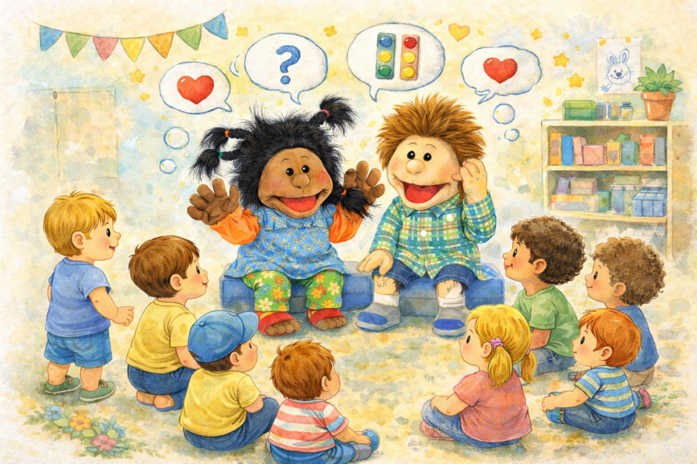 Unsere beiden Handpuppen Leny und Max sind ein fester Bestandteil unseres Alltags. Besonders im Morgenkreis, aber auch zwischendurch, schauen die beiden immer wieder vorbei, um mit den Kindern Themen zu besprechen, Fragen aufzugreifen oder kleine Alltagssituationen verständlich und greifbar zu machen. Mit viel Charme und einem Augenzwinkern helfen die Beiden dabei, Gefühle, Regeln oder neue Inhalte kindgerecht zu vermitteln – und sind dabei echte Lieblinge unserer kleinen Zwerge.