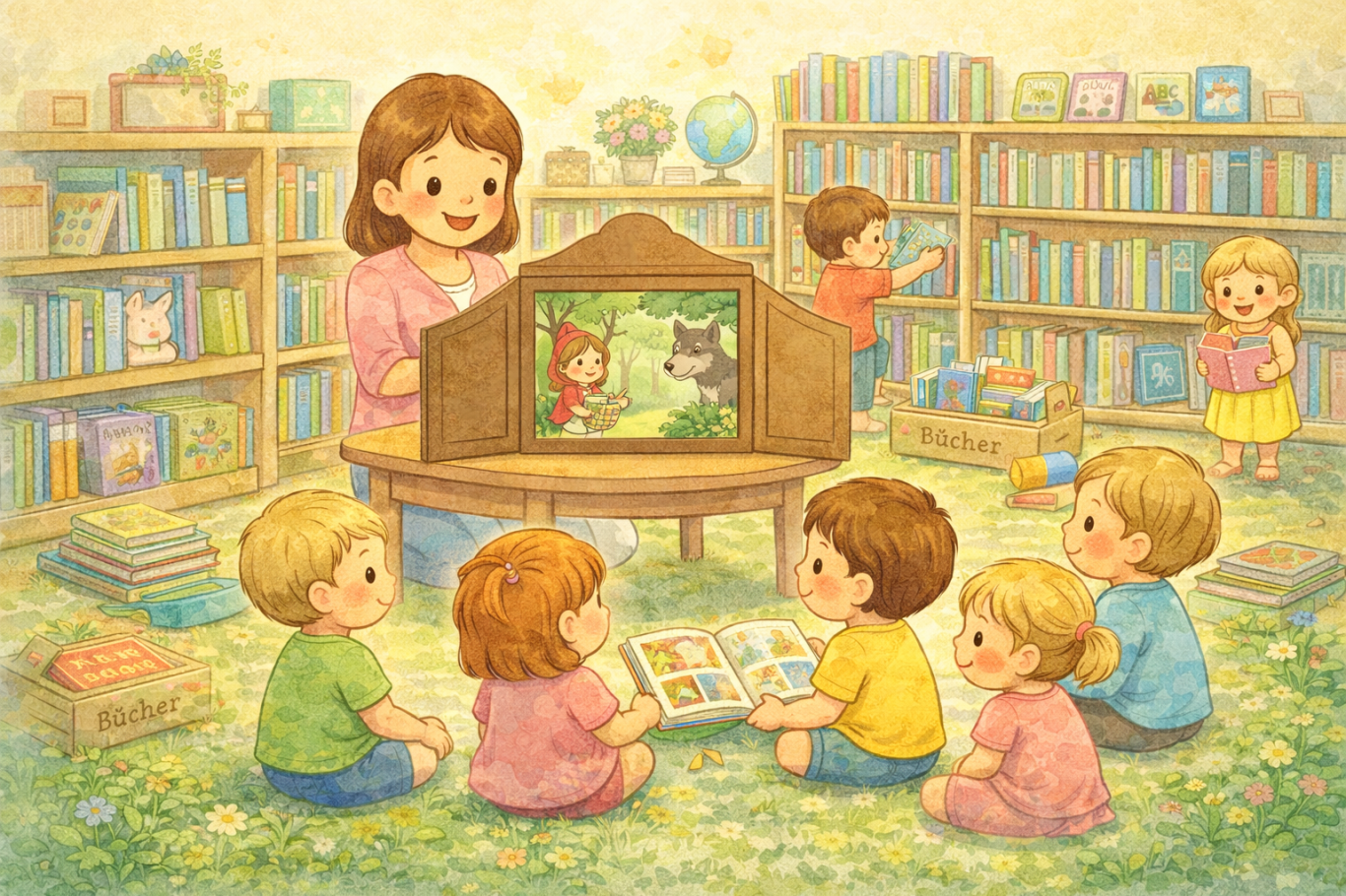 Einmal im Monat besuchen wir gemeinsam mit den Kindern die Bibliothek. Passend zu unserem aktuellen Projekt liest uns dort eine Mitarbeiterin oder ein Mitarbeiter eine Geschichte vor und nimmt sich Zeit für die Kinder. Anschließend dürfen die Kinder selbstständig stöbern, Bücher entdecken und sich ganz in Ruhe umschauen. Jedes Kind darf sich selbstverständlich ein Buch ausleihen und so die Freude an Büchern, Geschichten und Sprache vertiefen.