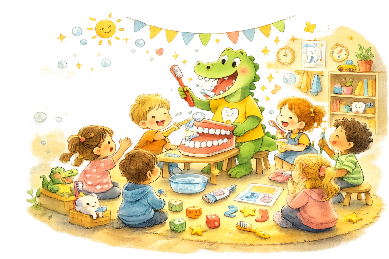 Zweimal im Jahr besucht uns „Kroko“, das Zahnputzkrokodil vom zahnärztlichen Dienst des Gesundheitsamtes. Spielerisch und kindgerecht zeigt es den Kindern, wie wichtig Zahnpflege ist und wie richtig geputzt wird. Mit viel Humor und anschaulichen Übungen bleibt das Gelernte gut im Gedächtnis – und das Zähneputzen macht gleich noch mehr Spaß.