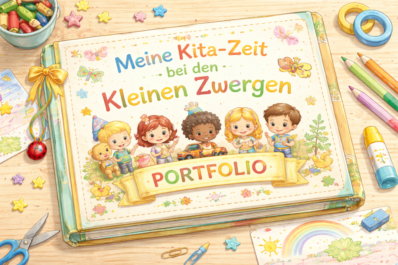 Bei uns gestalten wir für jedes Kind ein Portfolio – liebevoll, wertschätzend und individuell. Es lädt dazu ein, Erfolge wiederzuerleben, sich selbst zu entdecken und die eigene Entwicklung nachzuvollziehen. Das Portfolio ist für die Kinder jederzeit frei zugänglich und wird nach dem BEKiZ-Verfahren geführt. Mit vielen Fotos, Zeichnungen der Kinder, Erinnerungen an Feste, besondere Momente und kleine wie große Erfolge entsteht ein ganz persönliches Buch. Beim Verlassen unserer Einrichtung bekommt jedes Kind sein Portfolio als wunderschönes Andenken an die gemeinsame Kita-Zeit überreicht.