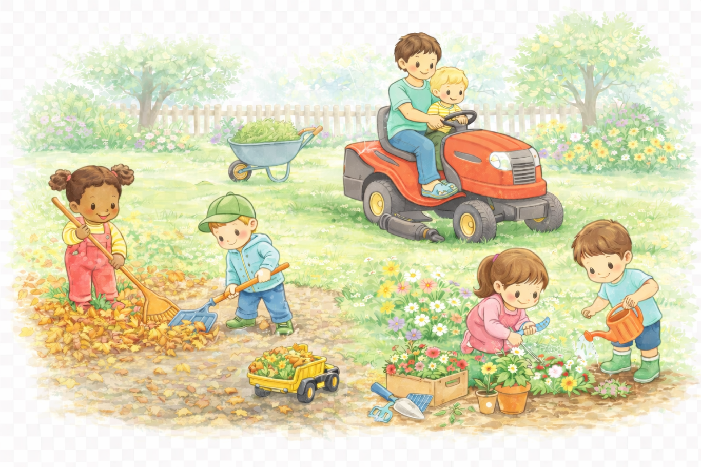 Unser großer, wunderschöner Garten ist nicht nur ein Ort zum Spielen, sondern auch zum Mithelfen und Mitgestalten. Hier wird gemeinsam Laub geharkt, Rasen gemäht – natürlich mit einem Aufsitzmäher, auf dem jeder einmal mitfahren darf – Blumen gepflanzt und gepflegt. Die Kinder erleben ganz praktisch, was alles zur Gartenarbeit dazugehört, und sind mit großer Begeisterung dabei.
