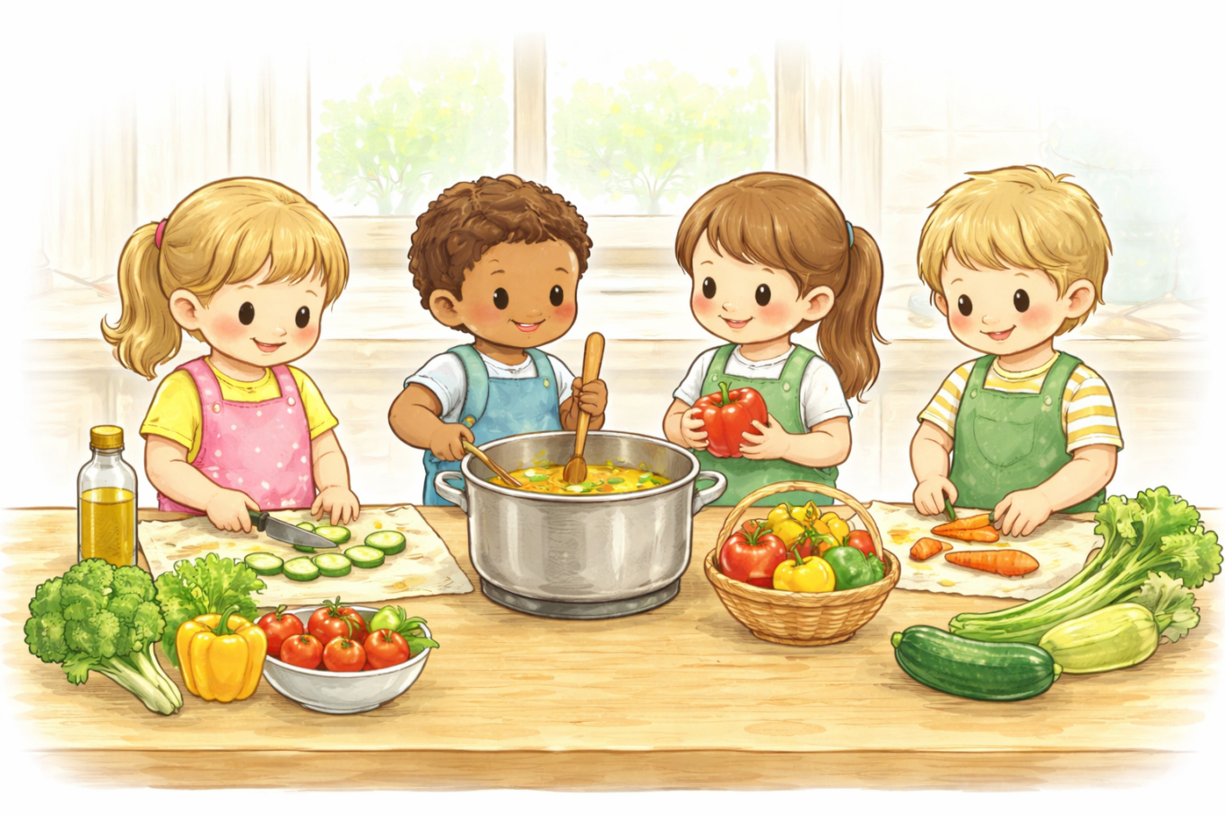 Ernährung ist für uns mehr als nur Essen – sie ist Teil unseres gemeinsamen Alltags. Wir beziehen die Kinder, wann immer möglich, aktiv mit ein: beim Waschen und Schneiden von Gemüse, beim Rühren, Tischdecken oder bei der Planung des Speiseplans, bei dem wir ihre Wünsche aufgreifen. So erleben die Kinder Mahlzeiten bewusst, lernen den Umgang mit Lebensmitteln und erfahren, dass gemeinsames Kochen und Essen Spaß macht und verbindet.